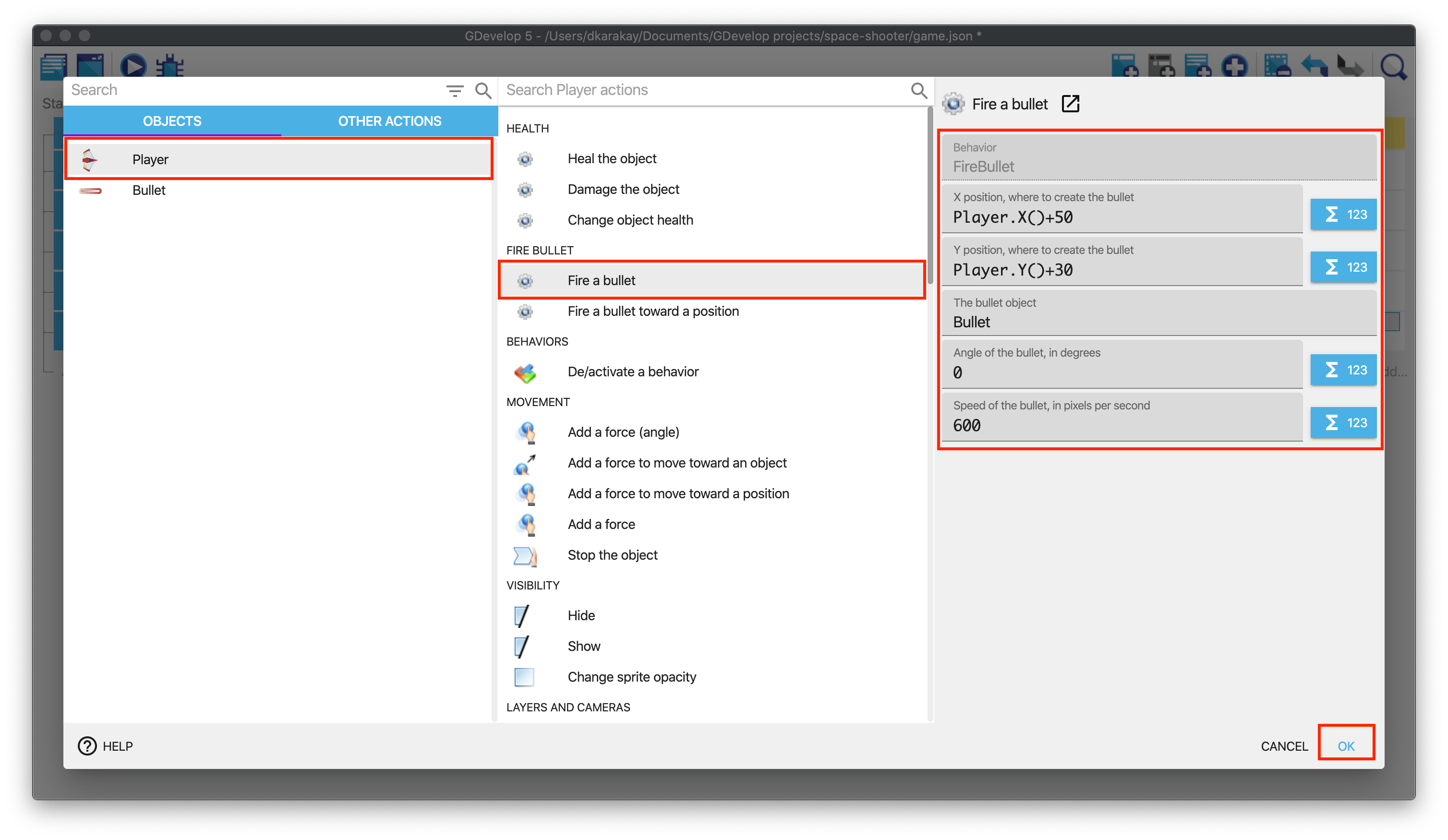 Player.X() is an expression that will be replaced by the position on the player's X-axis. We add 50 to position the bullet at the right of the object. The same goes for the Y-axis. The other parameters indicate that we'll create a "Bullet" object and gives it some speed. The angle is 0 degrees, meaning the bullets will go on the right.